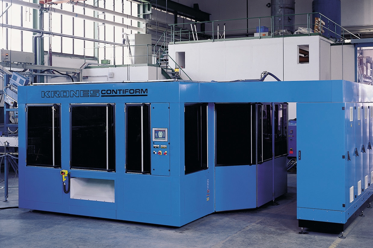 1997 entwickelte Krones die erste Streckblasmaschine: die kompakte, zweistöckige Maschine Contiform zum Erwärmen der Preforms und zum Streckblasen von PET-Flaschen.