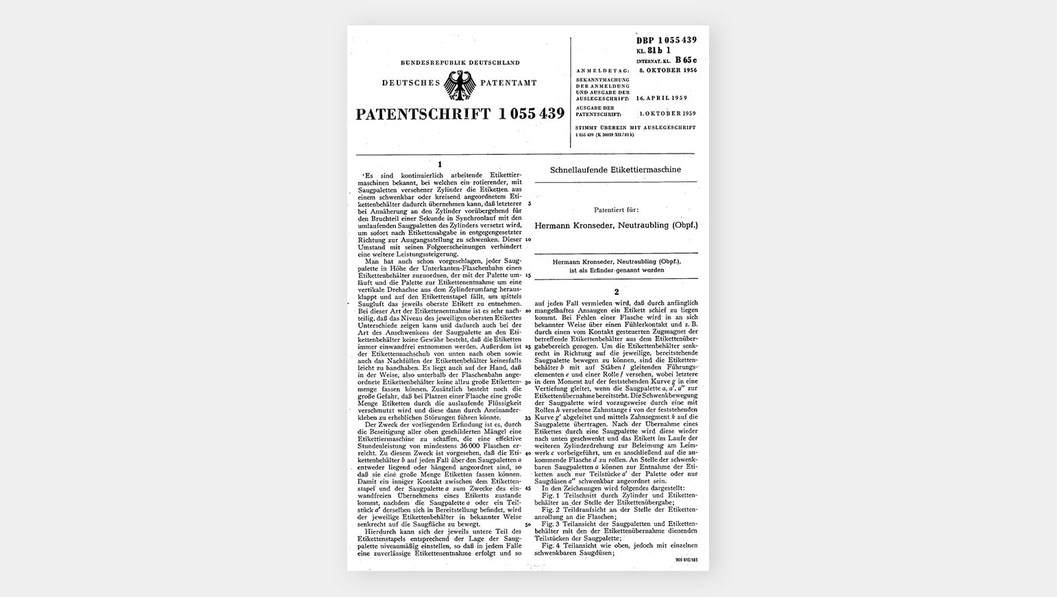 Das erste Patent von Hermann Kronseder zur ersten taktweise arbeitenden Etikettiermaschine
